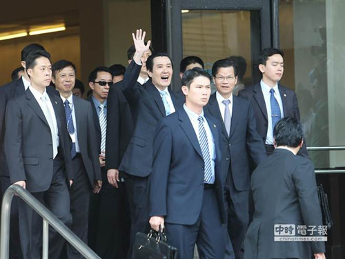 马英九(中)演讲结束步出会场,向场外抗议学者们挥手致意。 图片来源:台湾《中时电子报》