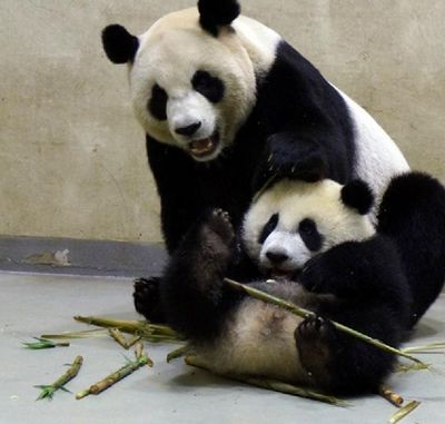 图为4月24日,“圆仔”在妈妈“圆圆”的“指导”下,学吃竹笋。