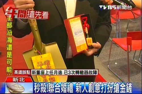 据报道,新北市今年的联合婚礼预计送出专业婚礼纪录DVD、炒菜锅、脐带血折价券和生育套房住宿券等多项好礼,但其中最受注目的还是限量的24K金铲。