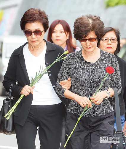 马英九母亲秦厚修病逝,昨天马的两个姐姐马以南(左)、马冰如(右)手持康乃馨出现台北第二殡仪馆,准备母亲出殡事宜。《中时电子报》