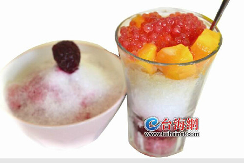 下午两点半,导报记者来到澎湖家竹黑砂糖冰店,这里已经大排长龙,在采访的半个小时内,等候的人数一直没有低于20人。清新的淡蓝色,简单的装修,是炎炎夏日的消暑好去处。这里的特色是黑砂糖冰,芋丸、果冻、粉粿、红豆等任选6样,再淋上浓浓的黑糖浆,一份50元(新台币,下同),可谓价廉物美。