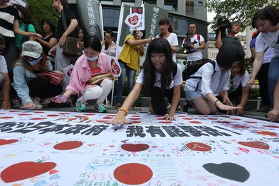 妇女救援基金会14日在日本交流协会前举办“814国际串连 声援慰安妇阿嬷”活动,参与民众在“一人一心”抗议布条上盖下手印,表达诉求。图自“中央社”