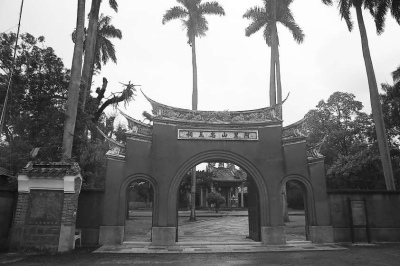 走进嘉义县中埔乡社口村,便能远远瞧见一道朱红色的山门,门上镌刻“阿里山忠王祠”六个大字(如图),旁边画着4只蝙蝠,寓意着赐福给进出山门的人。而这个红砖砌起的山门通过高低不一的围墙把五凤庙建筑连接起来。当地乡民告诉记者,这里便是闻名两岸的台湾古迹吴凤庙。