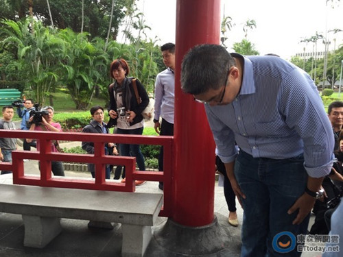 中新网10月24日电 据台湾“东森新闻云”报道,国民党籍台北市长参选人连胜文24日上午走访台北二二八纪念公园,特别到园区内的“伟人铜像”前献花鞠躬,在曾祖父连横的铜像前脚步停留特别久,记者询问是否因外界对祖宗的批评而眼眶泛泪,连胜文笑说,泛泪是真的没有。