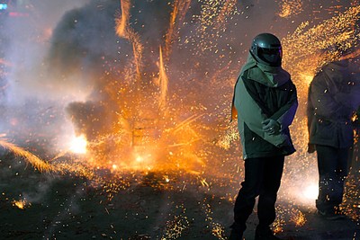 盐水蜂炮超刺激。台南盐水蜂炮3月4日晚间进入首波施放高峰,在入夜之后施放的炮城,声光效果更为刺激。来源:台湾“中央社”