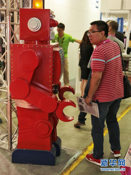 6月2日,一名男子被一台复古机器人吸引。当日,由台湾对外贸易发展协会及台北市电脑公会共同主办的2015台北电脑展在台北市南港展览馆开幕。本次展会聚焦智慧联网、行动应用、云端技术与服务三大新科技,吸引了世界各地1700多家厂商参加。新华社记者才扬摄
