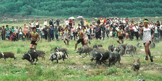 据台湾联合报报道,比赛中最具挑战也最有趣的是抓山猪,主办单位在河床高滩地把80只约重30台斤的小山猪放在围篱,供参赛者追捕,今年限几号队伍抓编几号的猪,只见选手们吆喝声、观众惊呼声及山猪的尖叫声,此起彼落;有经验的猎人,看清猪行进方向,飞扑而上抱住猪脖子,压倒在地,趣味横生,有3人被山猪撞伤。