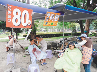 不景气,连理发都得计较,公园内的流动理发摊收费降价吸引不少人上门