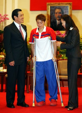 马英九接见中华台北奥运代表团,与受伤的跆拳道选手苏丽文(中)合影。(“中央社”图)
