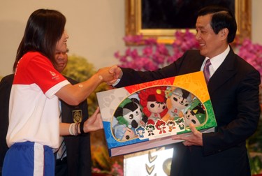 中华台北奥运代表团掌旗官赖圣蓉(左)赠送奥运福娃给马英九。(“中央社”图)