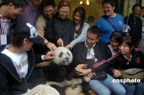 中新社成都八月二十三日电 (记者 杨杰)三十位台湾各界人士和近二十位台湾大学生今天上午风尘仆仆前往距成都一百三十余公里的卧龙自然保护区,近距离观看“国宝”大熊猫,并为选定的赠台大熊猫“团团”、“圆圆”举行生日晚会。