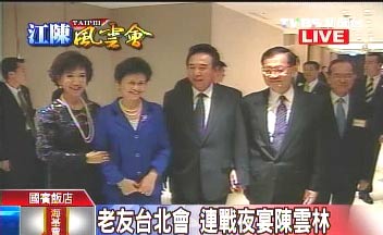 中新网11月4日电 据台湾“今日新闻”报道,海协会会长陈云林4日晚上应国民党荣誉主席连战伉俪之邀,与夫人赖晓华赴台北国宾饭店与政界、企业界共享晚餐,连战、陈云林在享用餐点前也先后致词。