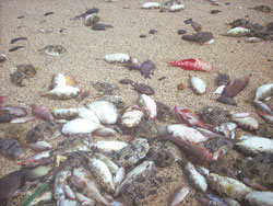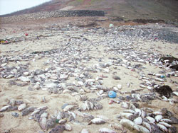 全乡只有四千余人的望安,是由十八个岛屿组成,但除了望安本岛外,其它都是无人岛。洪嫒慧说,从春节以后望安的海滩上就开始出现死鱼,最初还有不少民众捡拾,专挑大尾的或还有口气的,有些人一天可捡一百多公斤;但这两天海滩上的鱼都死了,已不再有民众捡拾,因此是遍地鱼尸,让人寸步难行,只能用惨不忍睹形容。