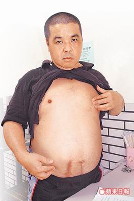 方某掀起衣服,显示腹部留下当年遭以细针逼供后开刀治疗留下的疤痕。(图:台湾《苹果日报》)
