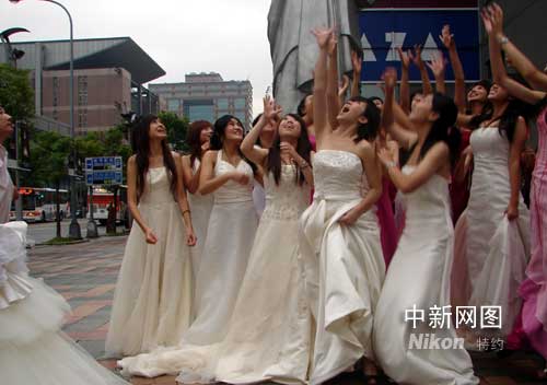 阿里山十月一日全台邀约二十二对新人到风景区共办“幸福婚礼”。图为九月二日记者会,主办方特邀的二十二位单身模特当街秀起抛捧花、抢接捧花。