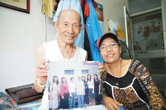 邓宝扬(左)认了12名干女儿,照片中就是他的干女儿们,李美玲(右)是最后1名干女儿,目前负责照顾他的生活起居。
