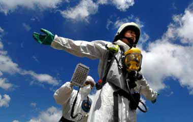 演习中举行辐射弹爆炸处置,身着防护衣的台军部队进行辐射侦测