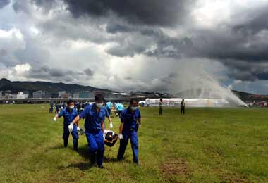 航空器事故救难演练,救难人员抢救模拟失事客机乘客。 “中央社”图