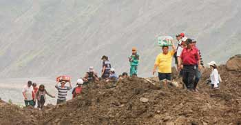 最困难是丽阳营区前和阿邦溪段,路基全不见,阿邦溪段还覆盖着大量砂石,大家摸着消防员事先架设的绳索,战战兢兢地侧身靠岩壁,一步步走过。