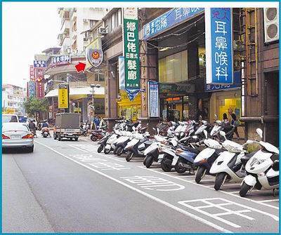 台北县一处派出所(箭头处)前方道路划设200米长的“警车专用”道,引起当地民众不满。(图:台湾《苹果日报》)