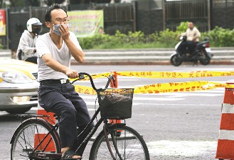 一位民众骑自行车经过,赶紧捂住口鼻。(图片来源:台湾《联合报》)