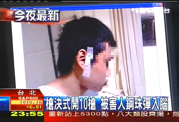 据台湾TVBS报道,从鬼门关走了回来的被害人,太阳穴上还包着白色纱布,到现在还有一颗钢珠弹留在脑部,等待手术取出来。只因为向老板说同事工作不认真,被害人就被像近乎处决的方式遭到连开10枪。