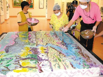 将蛋糕制作成100号(1号就是一张名信片大小),在长160公分、宽130公分的蜂蜜蛋糕上作画,这块蛋糕重100斤,以奶油打底为画布、天然食用玉米糖浆为颜料、刷子当画笔,蛋糕旁再以奶油作成画框,由画家张德镛和黄秀香共同创作。