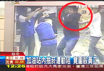中新网10月20日电 据台湾TVBS报道,台北市文化大学附近一家加油站,有一群飚车族到加油站加油,其中一名男子抽烟被劝阻,觉得没面子,竟然和同伴围殴加油站员工,监视器也拍下整个过程。