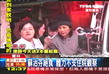 民进党籍云林县长苏治芬狱中绝食,已超过250个小时没有吃东西,体力不支,两度被送到医院观察。图片来源:台湾TVBS