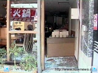 这间日本料理店的门口玻璃已经被震破留下满地残破的碎片,不难想象爆炸当时威力有多大,店家隔壁的公司都受到波及,天花板整片被震落,只剩下电灯摇摇欲坠。