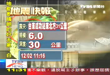中新网12月2日电 据台湾TVBS报道,今天(2日)中午11时16分,台湾地区发生里氏6.0级地震,震中在台东县成功地震站东北方31.3公里处。