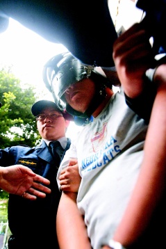 简家一死二伤案发后,警方根据目击者提供该男子所骑摩托车车牌号码,到他的租住处查缉未获,通报各大医院注意刀伤患者。警方后来护送死者儿子到医院急救时,赫然发现男子正在病床包扎伤口而逮捕他,在他的随身袋子、摩托车置物箱内找到凶刀、鎯头。