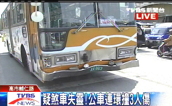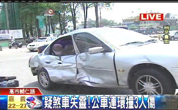 中新网4月17日电 据台湾TVBS报道,高雄市区下午传出一起连环车祸,一辆高雄市公交车,疑似煞车失灵,一路失控擦撞多辆轿车、摩托车,造成3人受伤送医。