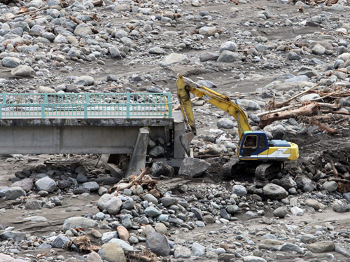 莫拉克台风豪雨袭台,山区大量沙石淤积河床,桥梁几乎乎被淹没