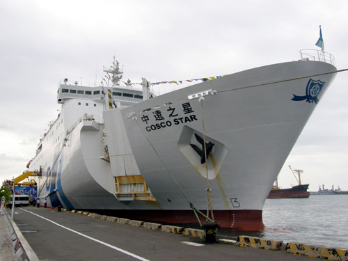 中新网5月10日电 10日上午8时,载着339名旅客的“中远之星”客滚轮经过约9个小时的航行,从厦门渡海直航靠泊高雄港3号泊位。据悉,这是目前海峡两岸最大、最豪华客滚船“中远之星”直航台湾的第三个城市,也是该轮开通厦门-台中、厦门-基隆常态化客滚直航航线后的又一次新跨越,标志着厦门与台湾的港航合作又开新局。