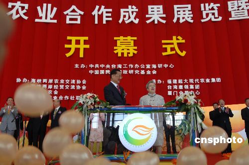 10月19日上午九时,中共中央政治局委员、国务院副总理吴仪与中国国民党名誉主席连战,在厦门共同启动“海峡两岸农业合作成果展览暨项目推介会”开幕杠杆。中新社发 郑祚声 摄