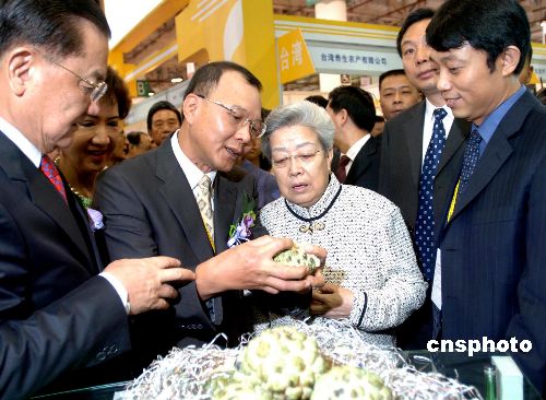 “海峡两岸农业成果展览暨项目推介会”19日在厦门举行。参展的台湾客人向国务院副总理吴仪介绍水果新品。中新社发 郑祚声 摄