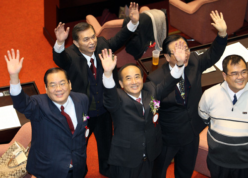 台湾地区第七届“立法院”二月一日选举“立法院长”,中国国民党籍“立委”王金平(前左二),以85票对27票打败对手,确定连任“立法院长”,中国国民党籍“立委”曾永权(前左一)则高票当选“副院长”。(“中央社”图;郭日晓摄)