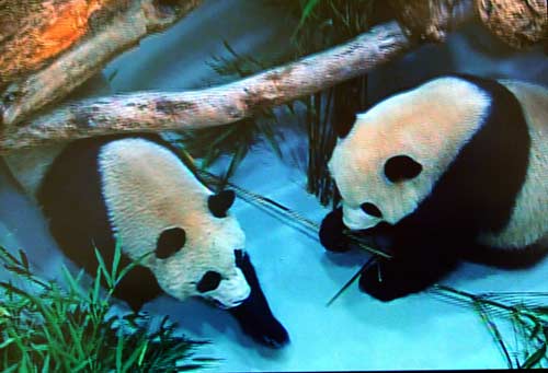 大陆赠台大熊猫“团团”(右)“圆圆”23日晚间抵达新家台北市立动物园,经过半小时的适应,晚间八时过后由“团团”开始在台湾的第一次进食。