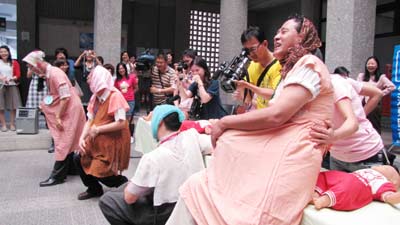 中新网3月4日电 据“中央社”报道,屏东县4日举办妇女节系列活动中的“超级妈妈闯关”活动,县长曹启鸿(右)等扮孕妇,体验妈妈的辛劳。
