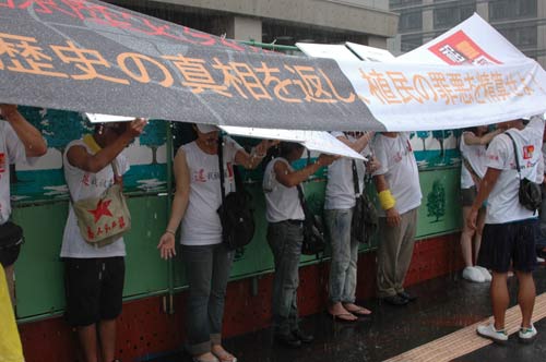 据台湾《联合报》报道,一行50多人于中午时分前往日本国会议事堂旁边的参议员会馆前,高举控诉日本殖民时期迫害台湾少数民族的巨大布条及历史照片,高喊“拒绝参拜”、“还我祖灵”、“日本反省、谢罪和赔偿”等口号,表达他们对日本的抗议。