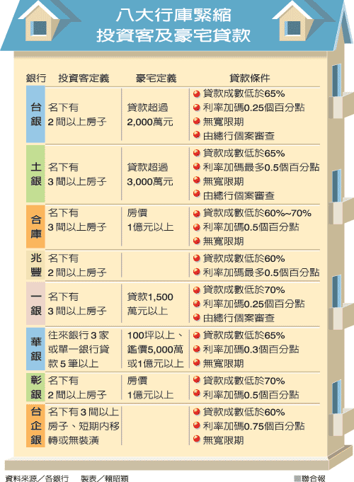 对投资客最严的是台湾企银,董事长罗泽成说,只要个人名下有三间以上的房子,符合房子未装潢、短期移转等条件,利率将大幅加码0.75个百分点,贷款成数上限也只有六成,同时取消宽限期。