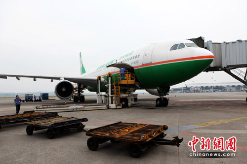中新网重庆5月26日电 (记者 郭晋嘉)随着富士康、英业达等台企入驻重庆,今年以来渝台直航航线客运持续火爆,货运开始升温。5月26日,台湾立荣航空的B7192航班由麦道90机型改为252座的空客330机型执飞,这是重庆—台湾航线首次采用大型宽体机,也是首次大批运送货物。