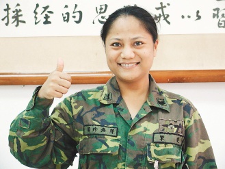 38岁陈梅珍从小想当护士,中学毕业考上护专,但学费贵,家里无力负担。念完高中后,为减轻父母负担,入伍成为台军首批志愿役女士官。现在是陆军空降训练中心士官长,去年协助训练连上人员,获得“莒光连队”殊荣。