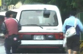 两位民众从便利店提了一大袋东西出来,外型方方的像饮料,两人都穿运动服,其中一个还著短裤一派轻松的样子,接着上了车,不过,这一看仔细可不得了,这车的侧面有岸巡总队的徽章,还有个红十字,说明这是台军用救护车,却被岸巡员在不是执勤时穿便服拿来代步买饮料。