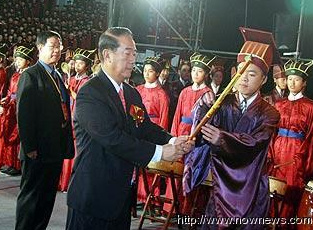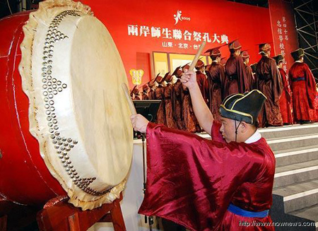 中新网9月27日电 2009年第二届中华文化快车两岸师生联合祭孔大典今日上午在新竹隆重登场,祭孔大典更开创先例,透过因特网同步同时在新竹、北京、山东三地联合进行,万余名两岸师生共同参与。亲民党主席宋楚瑜更第二度应邀担任祭孔大典正献人,这也是近60年以来,台湾民间祭孔规模最大的一次集会。
