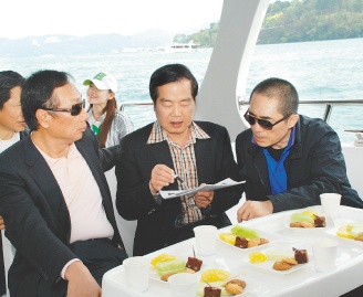 郭台铭与李朝卿昨天并陪着张艺谋搭船游湖。为了让张艺谋能坐在视野最好的船弦边座位,郭台铭还亲自将靠船弦的桌上餐盘移到另一桌,笑着招呼张艺谋就座。