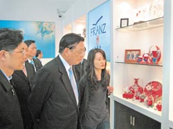 海基会董事长江丙坤(中)参访江西景德镇的台资企业海畅法蓝瓷。图片来源:中国时报