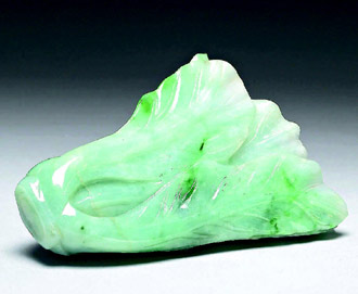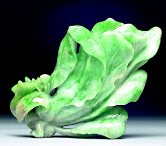 清代喜用各种材质模拟真的植物种在花盆,翠玉白菜造形从清代中晚期开始流行,是吉祥题材。故宫明星展品“翠玉白菜”原置于“永和宫”,摆置在珐琅盆中。“翠玉小白菜”原藏于“永寿宫”。中心开有一孔的“翠玉白菜花插”非常娇小,被归类在“珍玩库”,不像另两件列在“玉器科”,过去它从未曾公开展出过。