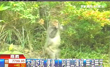 中新网12月21日电 据台湾TVBS报道,阿里山现在也出现弥猴,猴子为了吃东西,还会双手合十拜托民众给香蕉吃,不过看到民众不肯给,猴子居然调皮的,跳到民众的车子上排泄,甚至还会把山上的花摘来吃,让民众好气又好笑。